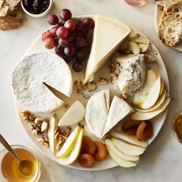 Save An elegant and inviting cheese platter featuring a curated selection of French cheeses, fresh fruits, nuts, and artisanal accompaniments perfect for sharing and celebrating the passion for cheese.