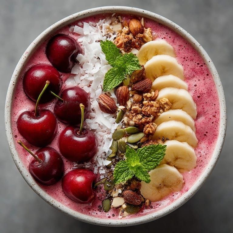 You can prep smoothie freezer packs by portioning cherries banana and spices into zip bags for grab-and-go mornings. When ready to eat dump a pack into your blender with yogurt milk and protein powder then blend and top as usual. This trick works especially well if you prep multiple bowls ahead.