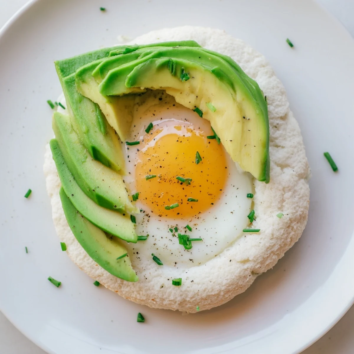 - Top each cloud bread with avocado slices and a poached egg, then season with salt, pepper, chives, and whatever else calls to you. The warm yolk should spill down into the clouds when you cut into it.