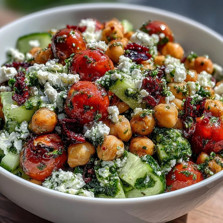 I distinctly remember bringing a bowl of this chickpea salad to a rooftop lunch with three friends, where conversation lingered and the city buzzed softly below. Someone spilled a few cherry tomato halves on the table& we laughed, scooping them up with pita and sharing what was left. Later, I realized the salad’s refreshing balance kept things casual and helped the afternoon stretch into evening without anyone feeling weighed down. Now, I make it for nearly every impromptu lunch, especially when guests arrive hungry and dusty from travel. No one ever suspects how easy it is to throw together.