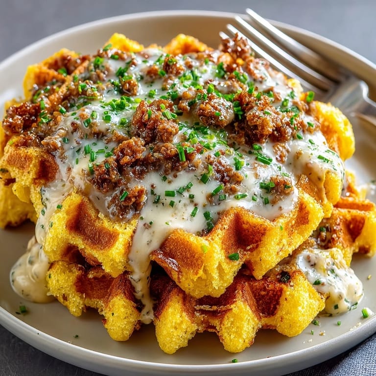 Cornbread has deep roots in Southern home cooking and often appeared alongside hearty gravies in farmhouse breakfasts Making it into waffles is a playful twist giving you more golden crispness and perfect cups for soaking up every drop of savory sauce