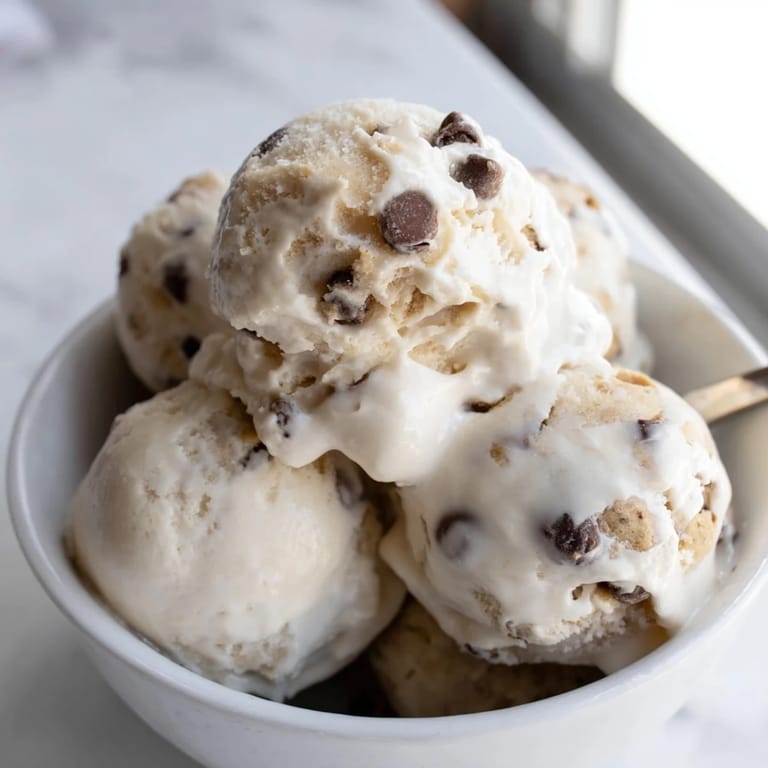 Save A creamy, protein-packed ice cream featuring whipped cottage cheese and bursts of edible chocolate chip cookie dough, perfect for a guilt-free frozen treat.