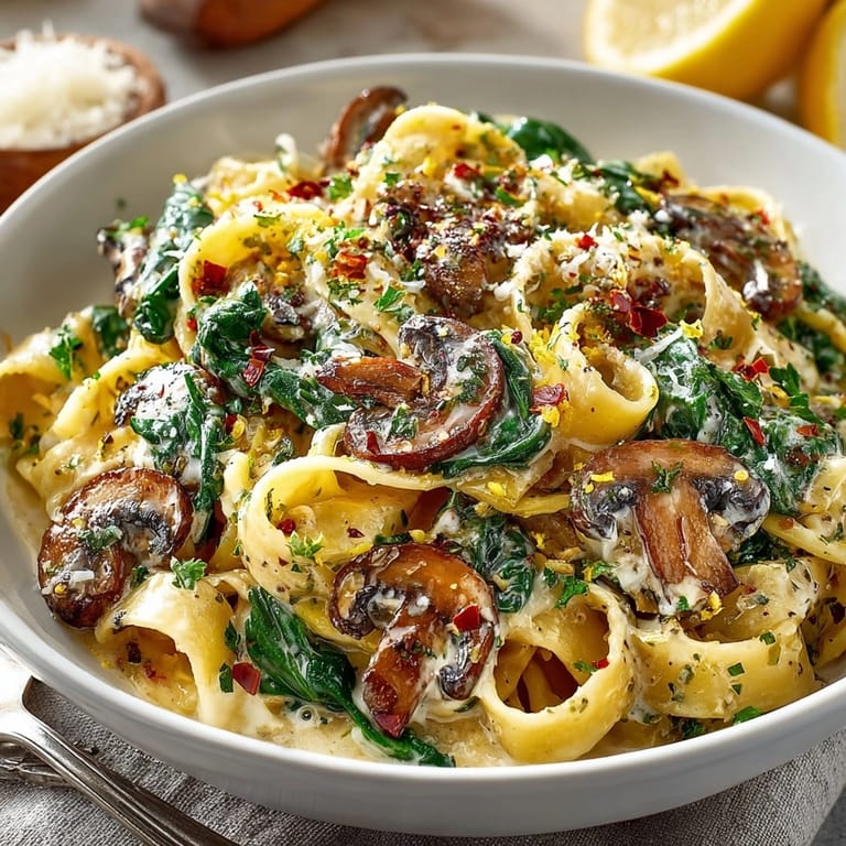 Save Fresh cremini mushrooms always steal the spotlight for me in this recipe their umami flavor pairs so beautifully with parmesan and garlic. One Sunday my little niece helped me tear the spinach and grate the cheese—she still brags about her "chef work" every time she sees this pasta on the table.