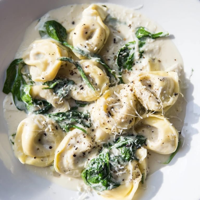 Save Tender cheese tortellini tossed in a rich, garlicky Alfredo sauce with fresh spinach for a comforting, restaurant-worthy pasta dish.