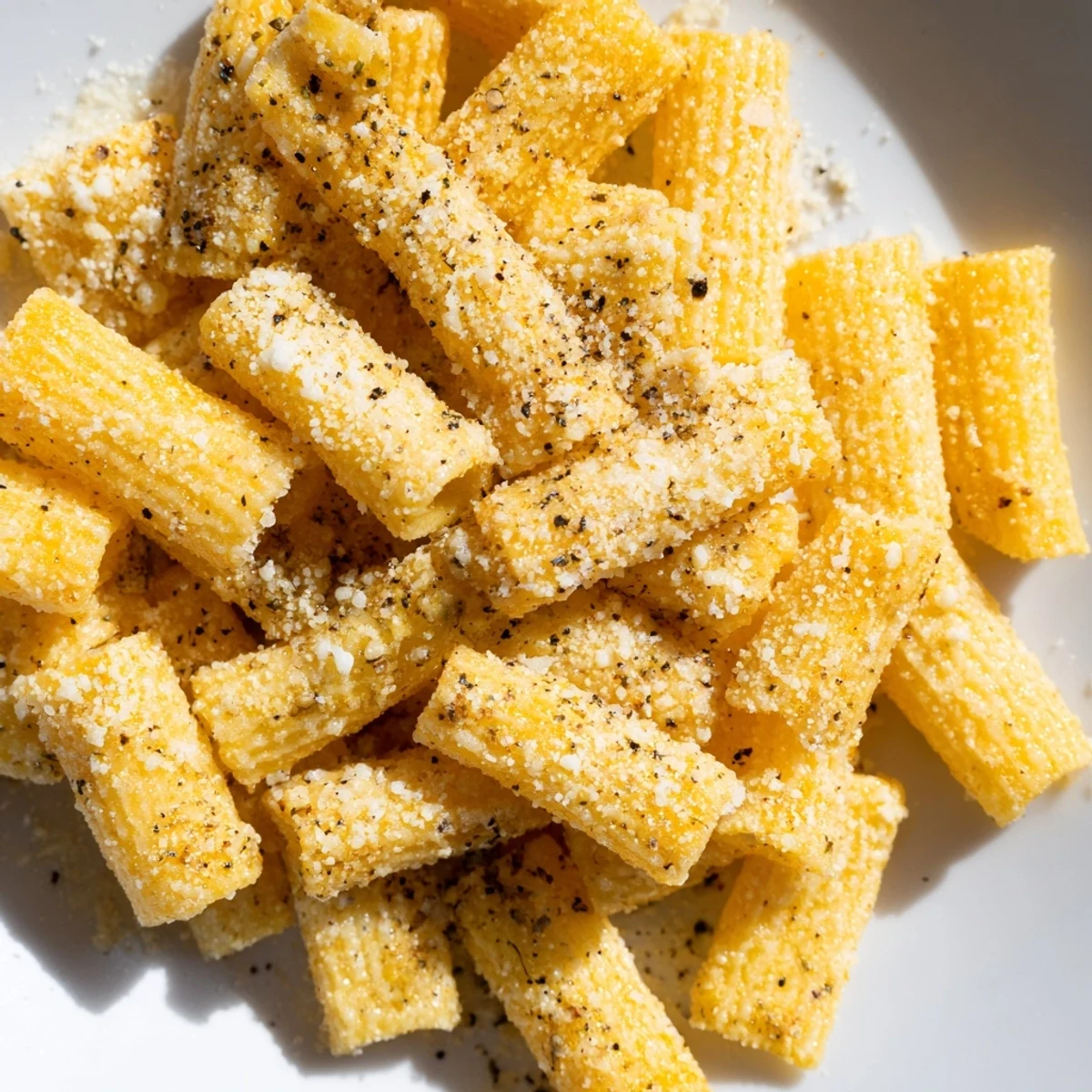 Golden, crispy pasta shells seasoned with Parmesan and spices, perfect for a flavorful snack.