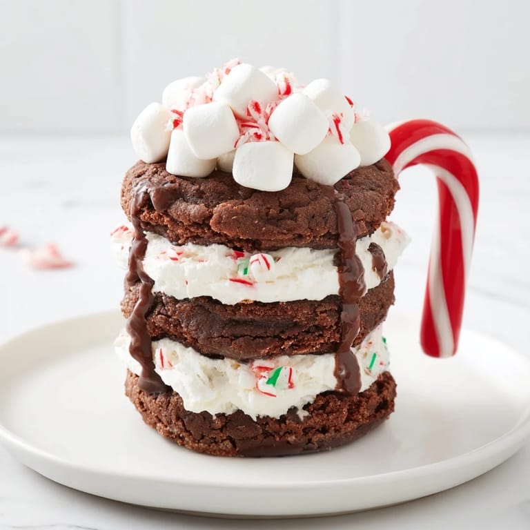 Save A playful, decadent dessert featuring layers of chocolate cookies and fluffy marshmallow frosting, stacked to resemble a cozy mug of hot cocoa.