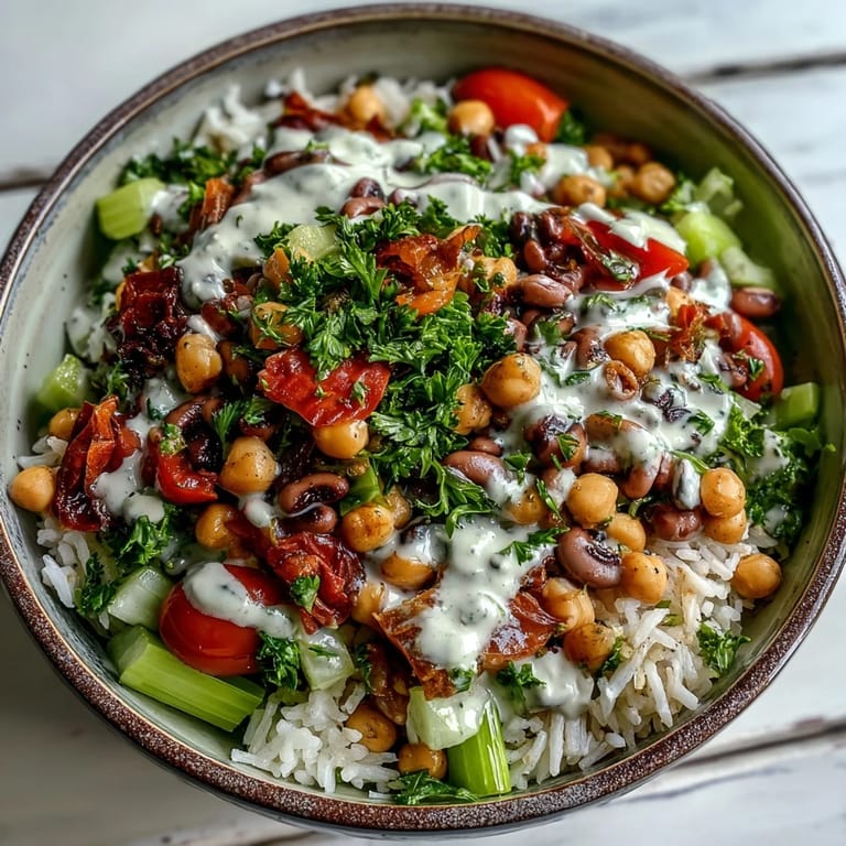 Save Start your year with a vibrant burst of flavor and nutrition with this New Years Hoppin John Salad. This protein-rich dish is a modern, fusion-inspired take on a Southern classic, featuring black-eyed peas and chickpeas tossed with fresh vegetables and a creamy tahini dressing—perfect for a healthy and auspicious start to the year.