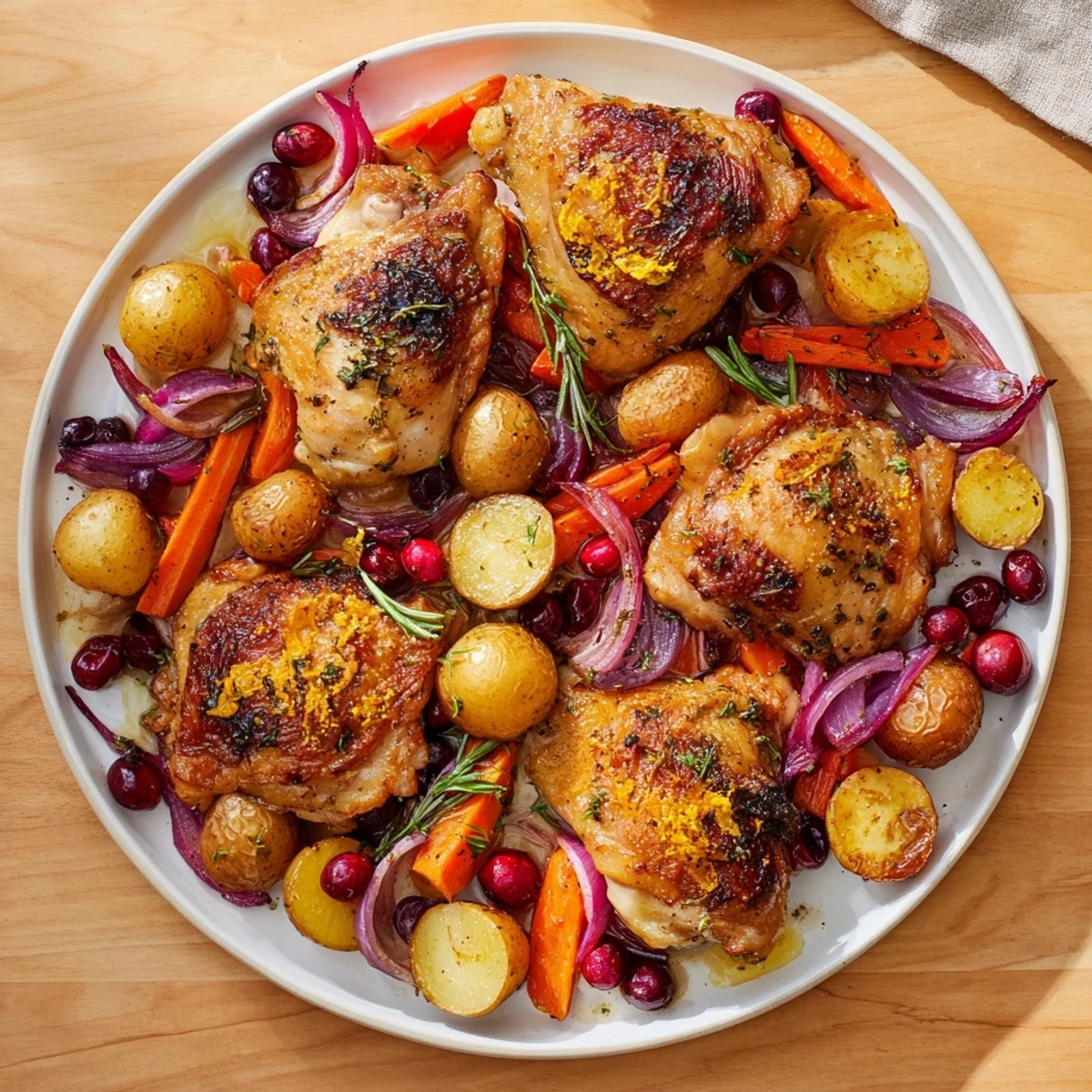 Save Succulent roast chicken thighs are infused with aromatic herbs and olive oil, then roasted with sweet-tart cranberries and root vegetables—all in one pan for an easy, festive meal.