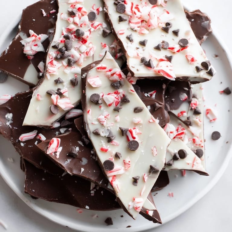 Save A festive, no-bake dessert featuring crisp layers of chocolate and white chocolate, studded with crushed peppermint candies and served as playful, shareable shards.