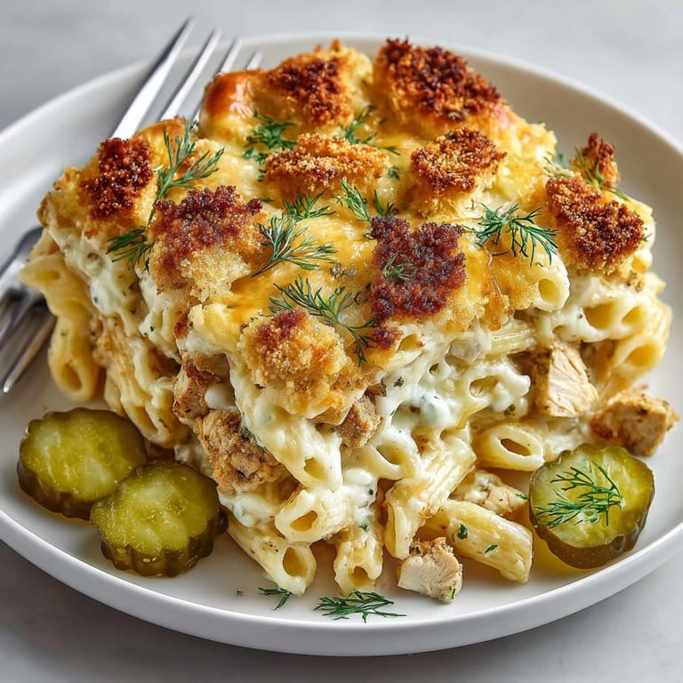 Save The dill pickle chips are truly the star ingredient here. I discovered their potential as a crust component entirely by accident when my son crushed a bag of chips onto his regular mac and cheese. The way they maintain their crunch while infusing the dish with tangy pickle flavor creates something truly special that elevates this from standard pasta bake territory.