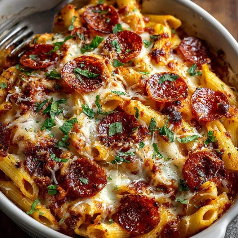 Italian American casseroles like this one came from the desire for hearty one-dish comfort food in busy households. This is a great way to use up extra pasta or cheese from your fridge and the toppings can be adapted to seasons or holidays try adding roasted zucchini in summer or mushrooms in fall. This recipe is often found on potluck tables and family gatherings because it draws on the familiar joy of pizza and pasta layers.