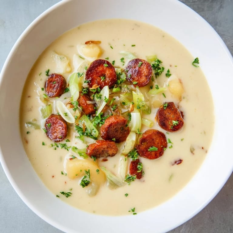 Save A hearty and flavorful soup combining creamy potatoes, tender leeks, and spicy chorizo for a comforting meal perfect for cool days.