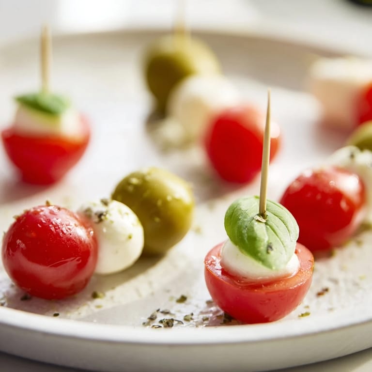 - On each skewer, thread one red cherry tomato, one mini mozzarella ball, one green grape tomato, and one basil leaf. Alternate the order for visual variety if desired.