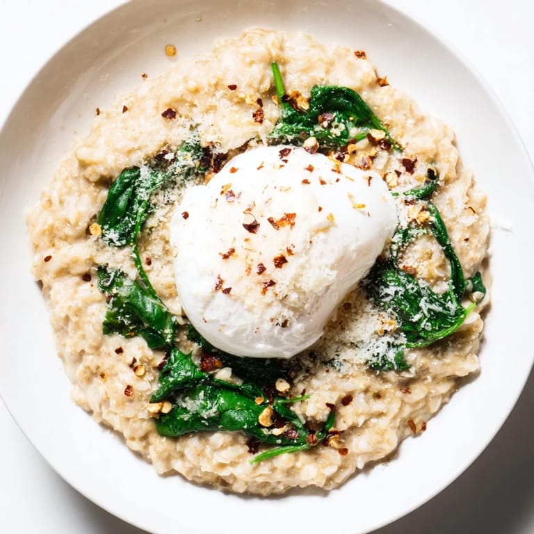Save A hearty, visually appealing breakfast twist on classic oatmeal, featuring creamy oats, sautéed spinach, and a silky poached egg. Nutritious, budget-friendly, and satisfying.
