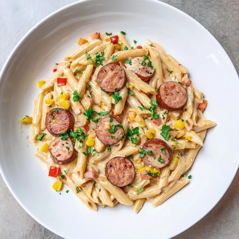 Save A creamy, spicy pasta dish combining smoky sausage, Cajun spices, and a rich Alfredo sauce for a comforting meal ready in just 20 minutes.
