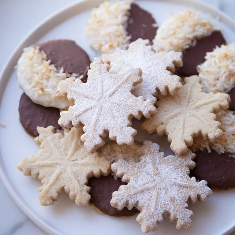 - Arrange white chocolate-dipped shortbread cookies and coconut macaroons in radiating arms around the center following a snowflake design.