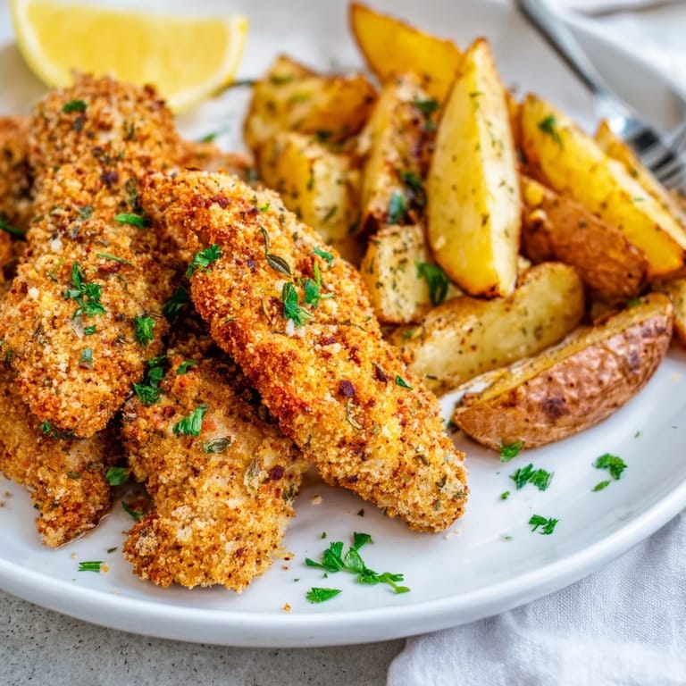 Save Juicy chicken tenders coated in fragrant herbs, served with crispy, golden-brown potato wedges for a wholesome and flavorful meal the whole family will love.