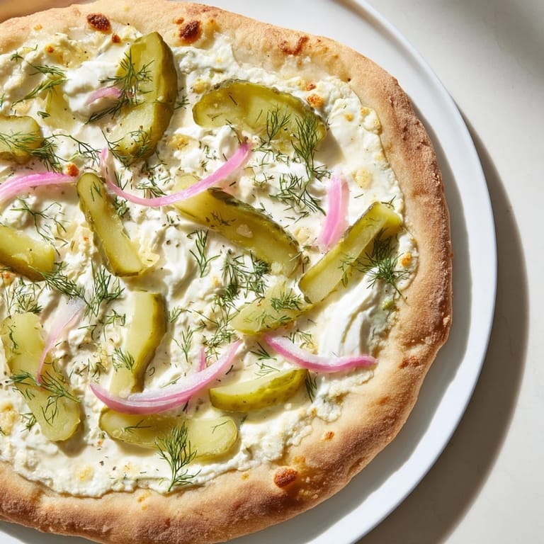 Save A tangy, creamy pizza topped with a rich crème fraîche sauce, mozzarella, and crunchy dill pickles. Perfect for adventurous pizza lovers seeking a unique flavor combination.