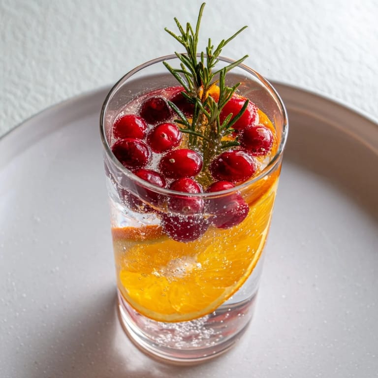 Save A festive, sparkling non-alcoholic drink featuring floating frozen cranberries, citrus, and a touch of wintery magicβperfect for holiday gatherings.