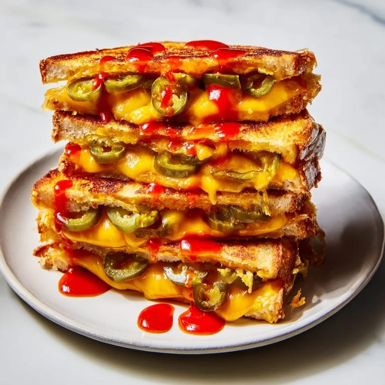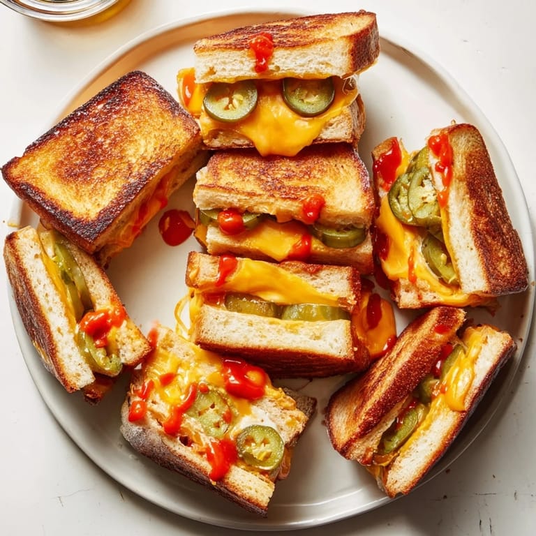 - Distribute dill pickles, fresh jalapeño slices (if using), and chopped pickled jalapeños over the cheese on each sandwich. Drizzle a bit of hot sauce on top.